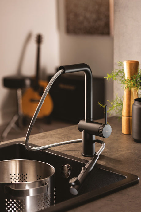 Nobili Live Pull-Out L Spout Kitchen Tap with Spray Hose & Contemporary Italian Design
